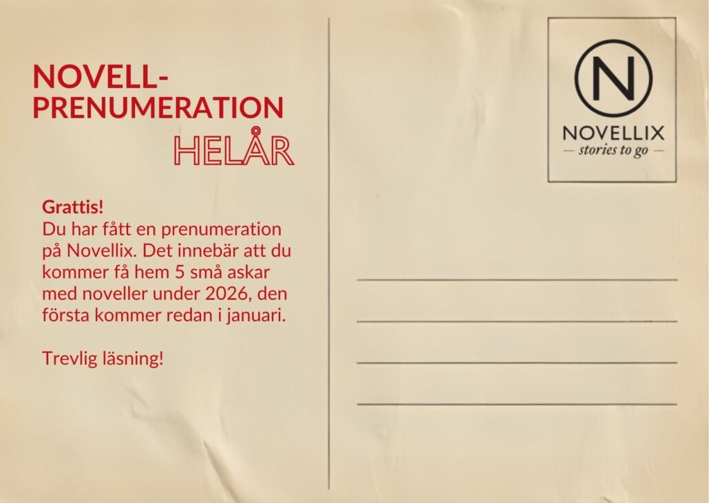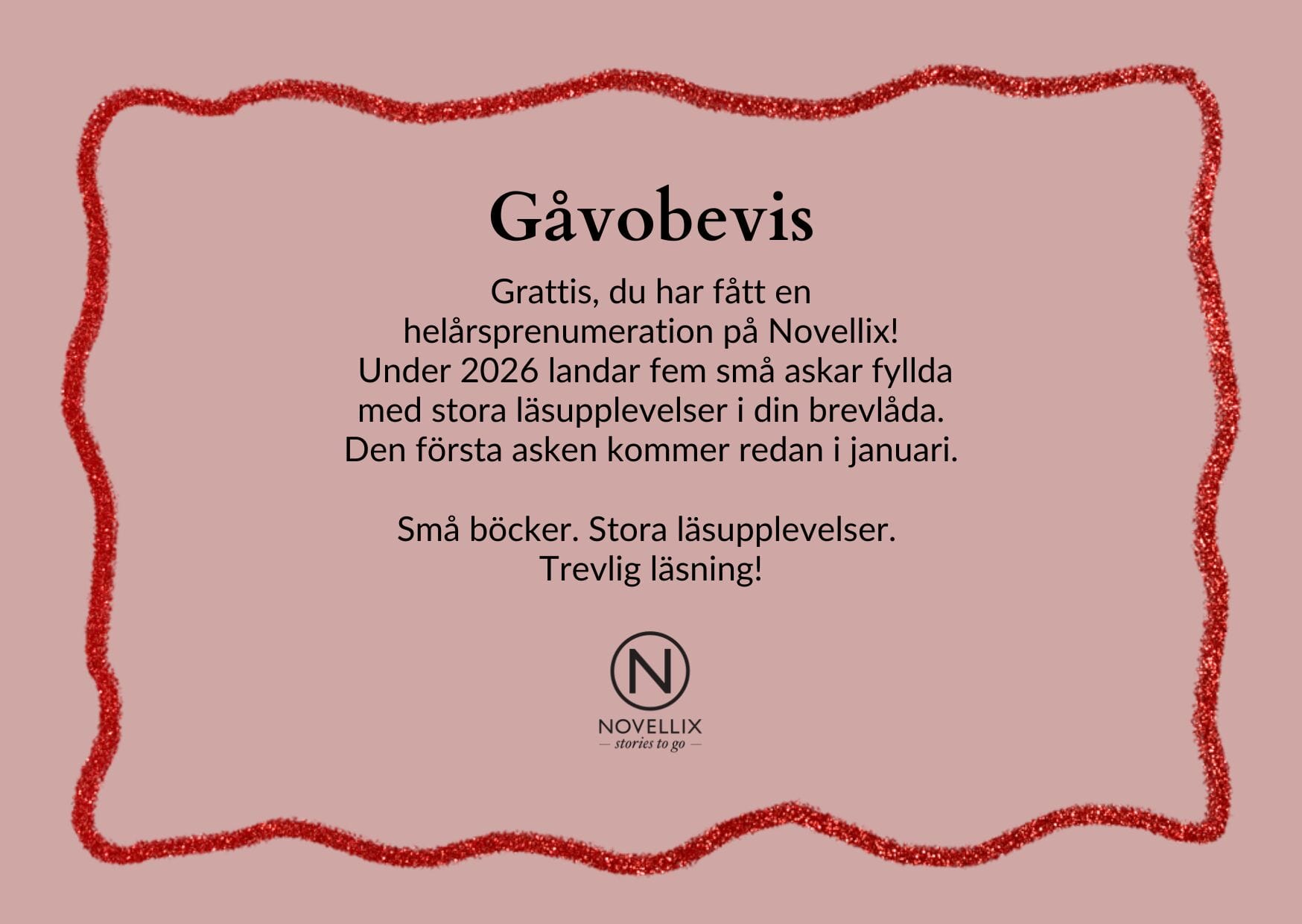Vil du ge bort en prenumeration i julklapp men är ute i sista minuten? Ingen faran! En novellprenumeration är den perfekta presenten till både bokslukaren och den som vill börja läsa mer – och du kan teckna en prenumeration ändra fram till 11 januari. För att ge bort en prenumeration anger du helt enkelt mottagarens adress under Leveransadress, du ändrar leveransadress genom att trycka på Ändra, det är förinställt på dina egna uppgifter, så dessa behöver du byta ut till mottagarens. Du kan sedan skriva ut ett gåvobevis eller skicka det till mottagaren digitalt – prenumerationen drar sedan igång i slutet av januari 2026.